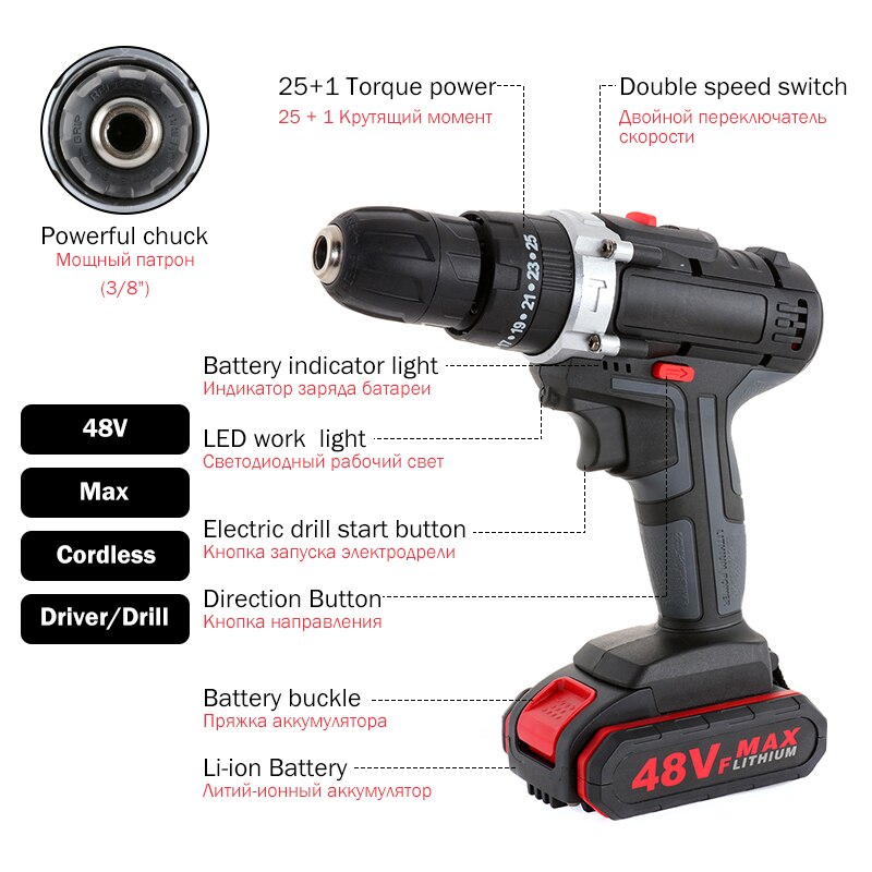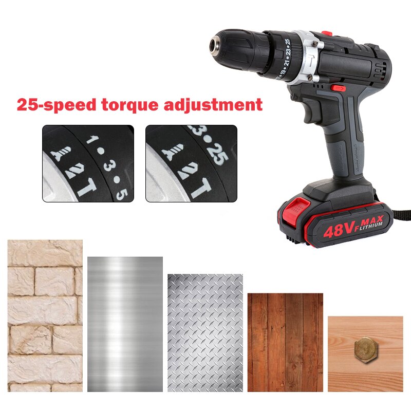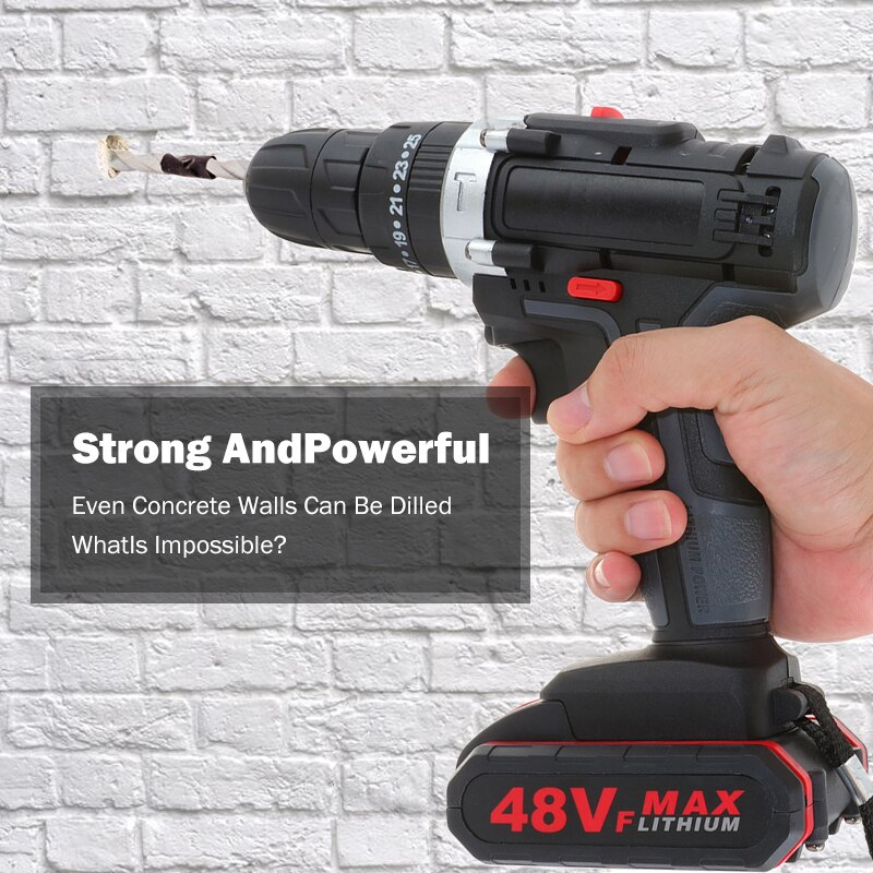 48VF Cordless Lithium Impact Drill Electric Screwdriver Impact Drill 1*/2 Battery + 1* Battery Charger